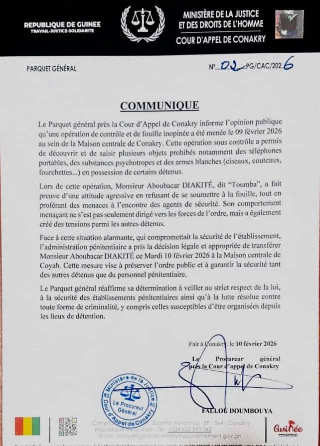 Aboubacar Sidiki Diakité, dit "Toumba", a été transféré ce mardi, 10 février 2026 à la maison centrale de Coyah. D'après un communiqué du Parquet général près la Cour d’appel de Conakry, ce transfert fait suite à une opération inopinée de contrôle et de fouille menée le 9 février à la Maison centrale de Conakry.